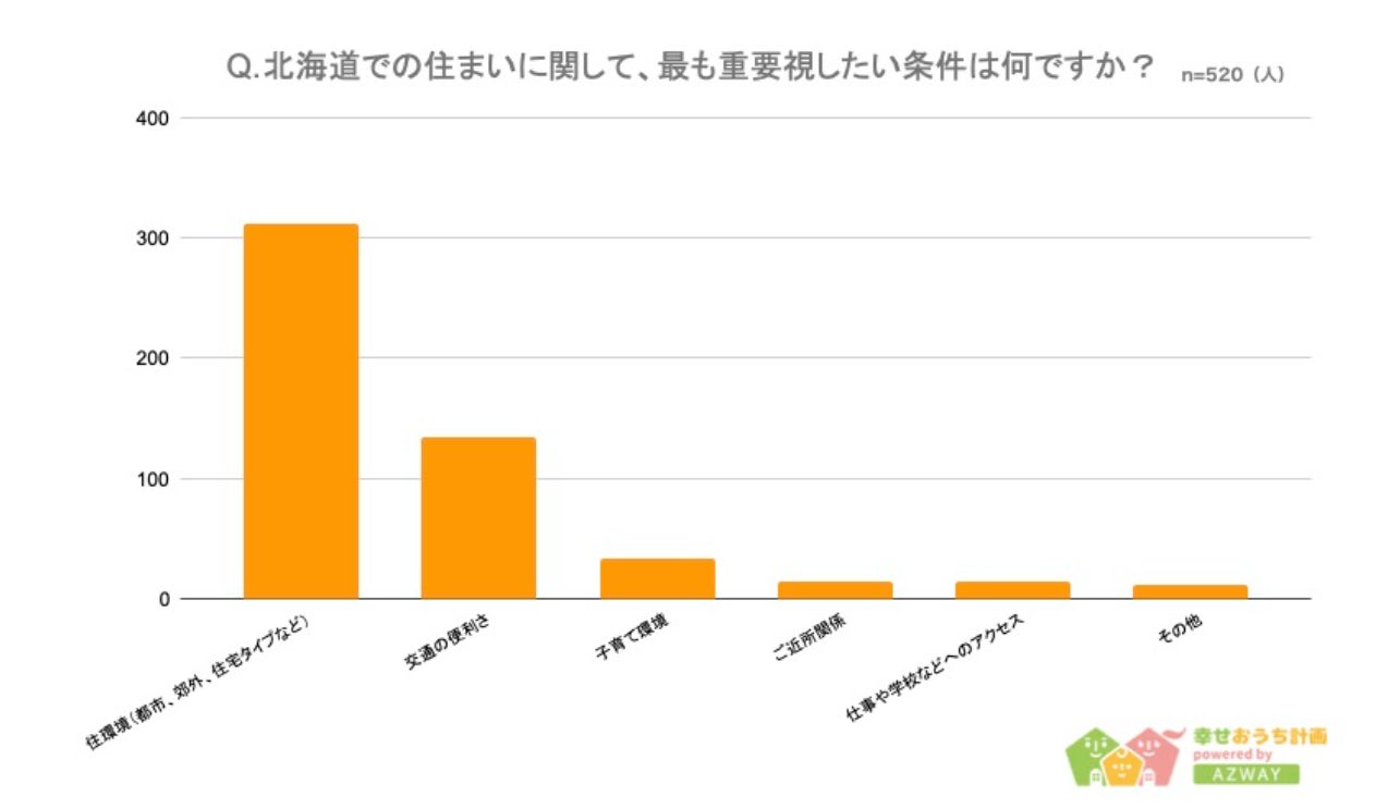 最後に「住まいで重視したいポイント」について聞いたところ、「住環境」が1位で312人、「交通の便利さ」が2位で134人、「子育て環境」が3位で33人という結果になりました。多くの人が、住環境やアクセスの良さといった生活する上での利便性を重視していることがわかります。普段の生活に北海道の「自然」や「食生活」を程よく取り入れつつ、便利さも兼ね備えた生活を求めていることが窺えます。