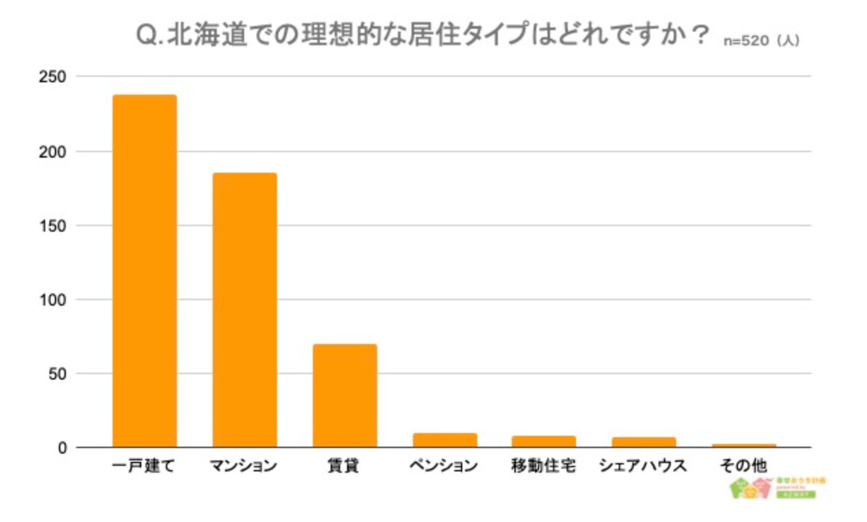 また、住みたい住居タイプについては「一戸建て」が1位で238人、「マンション」が2位で185人、「賃貸」が3位で70人という結果になりました。雪かきが大変なイメージのある北海道ですが、多くの人が一戸建てを希望していることがわかります。また、ペンションや移動住宅を選んだ人もおり、家にもこだわって北海道の自然を楽しむ生活を送りたいと考えている人がいるとわかりました。