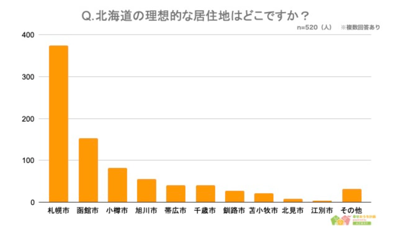 また、「北海道の中で住みたい街」について聞いたところ、1位が375人で「札幌市」、2位が153人で「函館市」、3位が82人で「小樽市」という結果になりました。ほどよく都会で不便のない都市が人気を集めており、多くの人が「自然」を求める一方で便利さも必要だと考えていることがわかります。