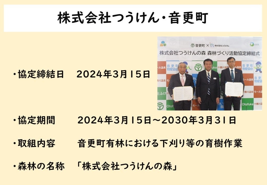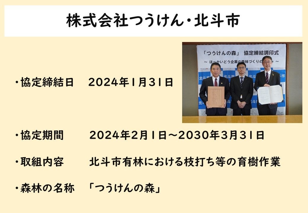 この度、株式会社つうけん(本社・札幌市)と北斗市(渡島地域)、旭川市(上川地域)、音更町(十勝地域)との協定が締結されました。それぞれ2024年から2030年までの約6年間で、枝打ち、下刈りなどの育樹の取組みを進めていくこととしています。