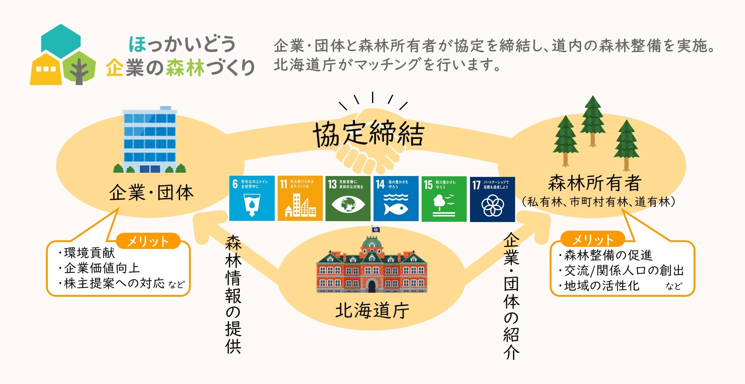 北海道では、環境保全に関心があり、SDGsやCSR活動等に取り組む意欲のある民間企業・団体と、フィールドを提供する道内市町村等の森林所有者とのマッチングを行う「ほっかいどう企業の森林づくり」制度により、企業等と連携した森林づくりを推進しています。