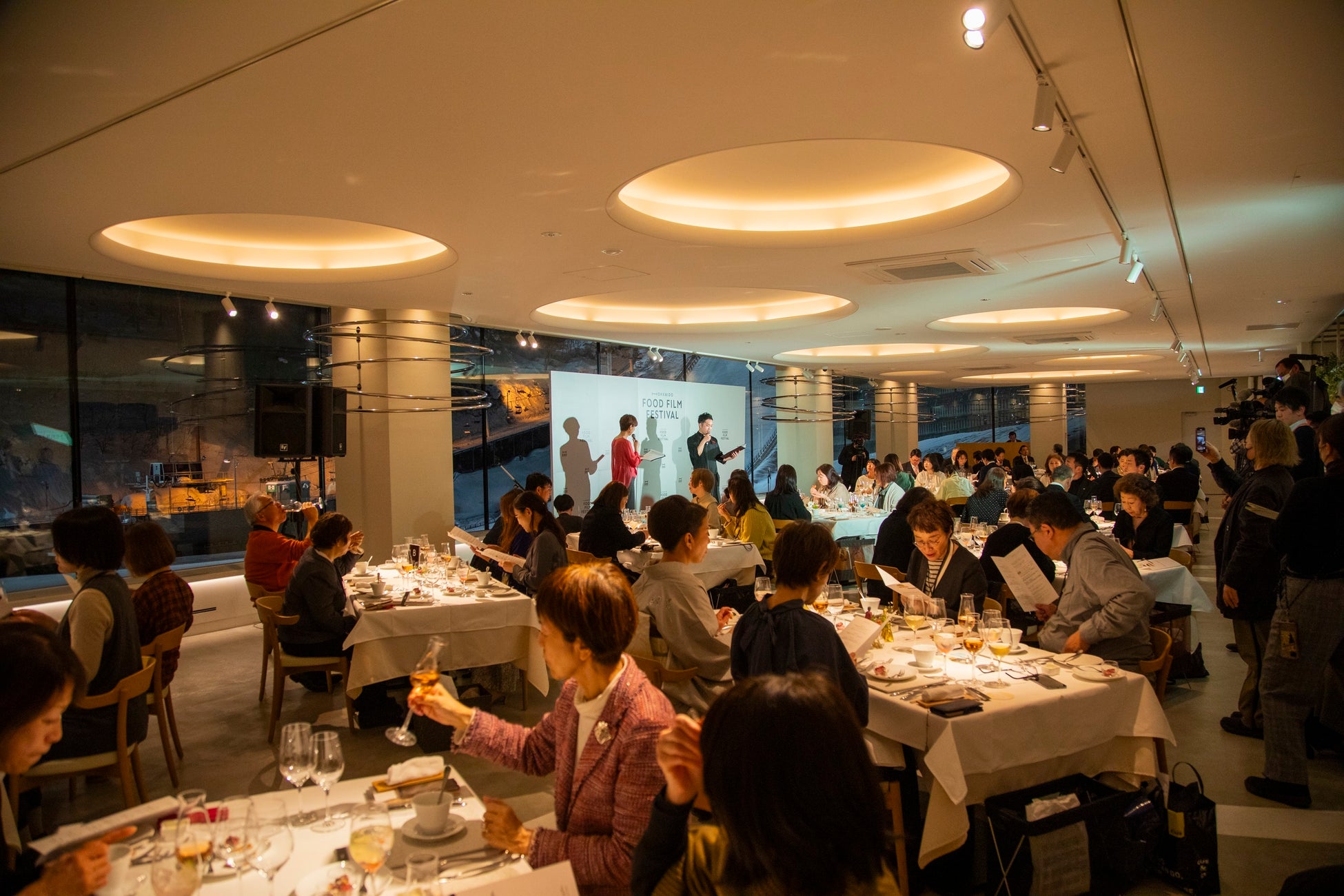 冒頭では 札幌・北海道フードフィルムフェスティバル実行委員会を構成する札幌市・秋元克広市長、(株)北海道新聞社・宮口宏夫社長、(株)クリエイティブオフィスキュー・伊藤亜由美社長が挨拶。実行委員長である伊藤社長の乾杯を合図に料理サーブが始まった