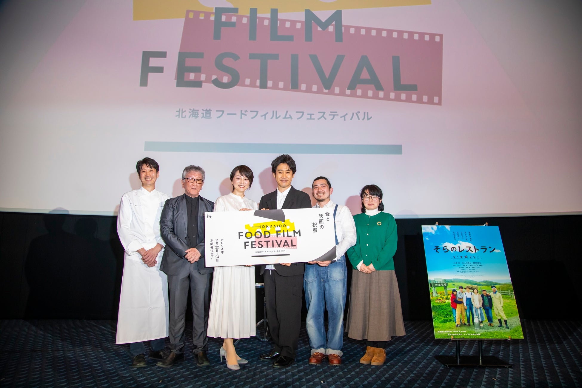 北海道を代表するフードシネマ。『しあわせのパン』『ぶどうのなみだ』に続く北海道映画の名作であり、北海道せたな町を舞台に豊かな自然が育むチーズと仲間の物語を描いた本作品。本編上映後、大泉洋さん・本上まなみさんが登壇すると大きな歓声に包まれ、集まった観客が豪華キャストのトークをたっぷりと楽しみました。またゲストとして本作のモデルとなったせたな町の生産者ユニット「やまの会」より冨樫一仁さん、村上健吾さん・妙子さんご夫妻が登場。さらに本作のフードアドバイザーを務めた塚田宏幸シェフも加わり、撮影中の思い出や作品をきっかけに繋がったせたな町とのつながりや交流エピソードを披露しました。