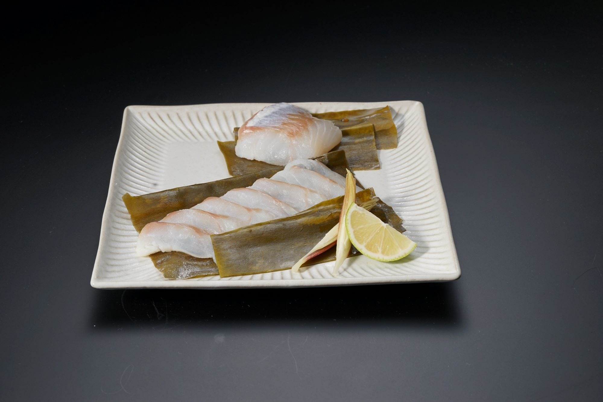 「昆布じめ」には、肉厚で柔らかく、粘りととろみの強い、北海道産の良質な「利尻昆布」を使用。柔らかく、濃厚でコクのある昆布の味わいが天然タラの旨味を引き立てます。