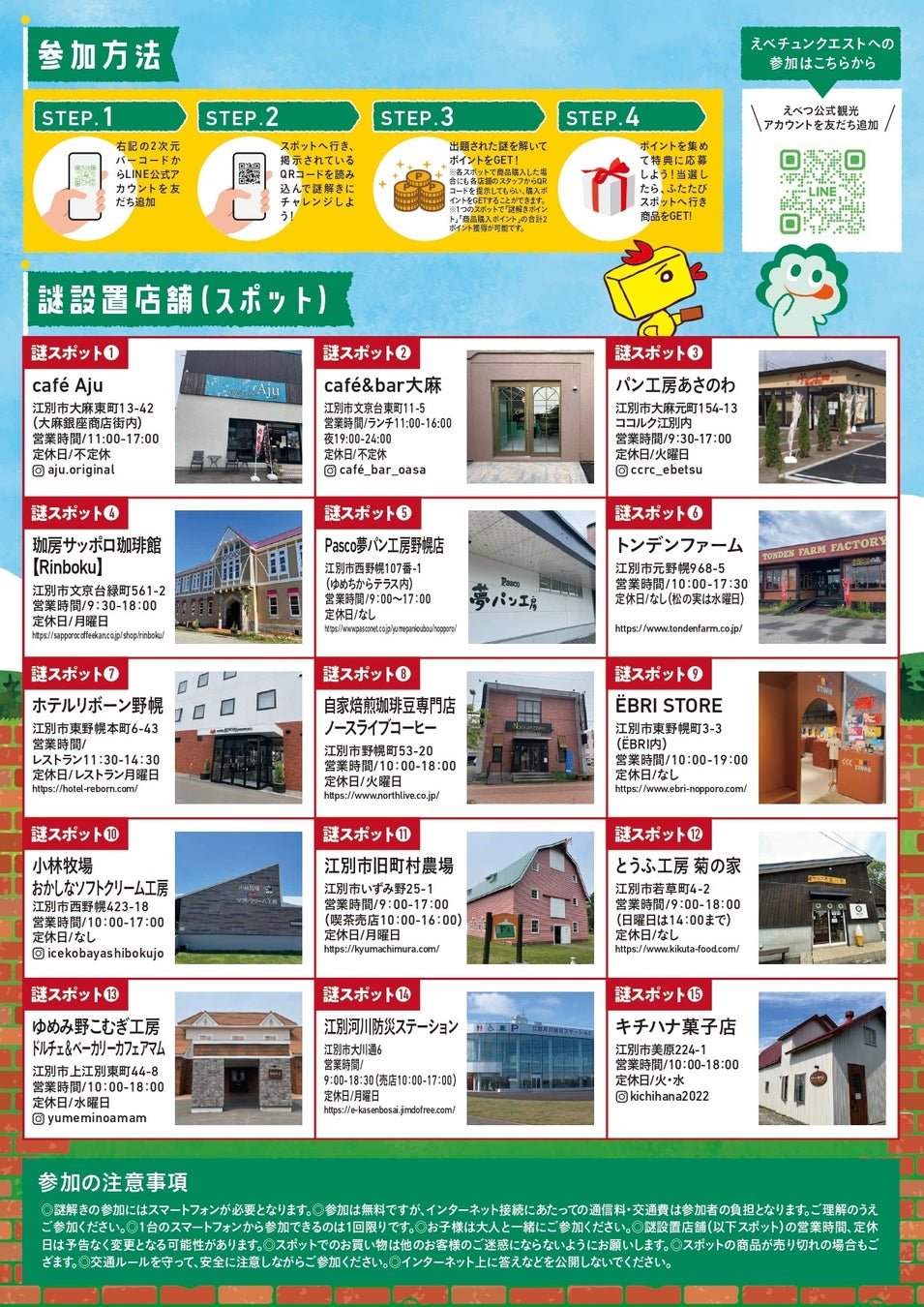 ■スポット対象:café Aju、café&bar大麻、パン工房あさのわ、珈房サッポロ珈琲館【Rinboku】、Pasco夢パン工房野幌店、トンデンファーム、ホテルリボーン野幌、自家焙煎珈琲豆専門店ノースライブコーヒー、ËBRI STORE、小林牧場 おかしなソフトクリーム工房、江別市旧町村農場、とうふ工房 菊の家、ゆめみ野こむぎ工房ドルチェ&ベーカリーカフェアマム、江別河川防災ステーション、キチハナ菓子店