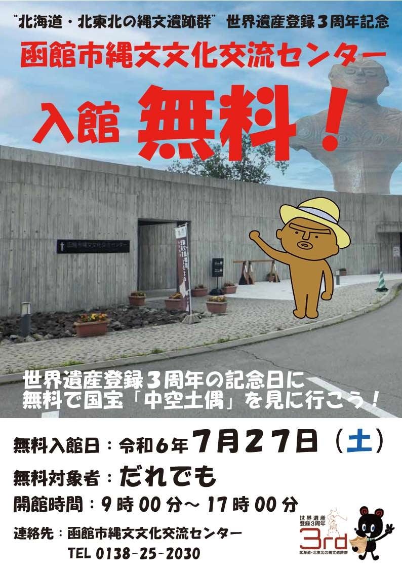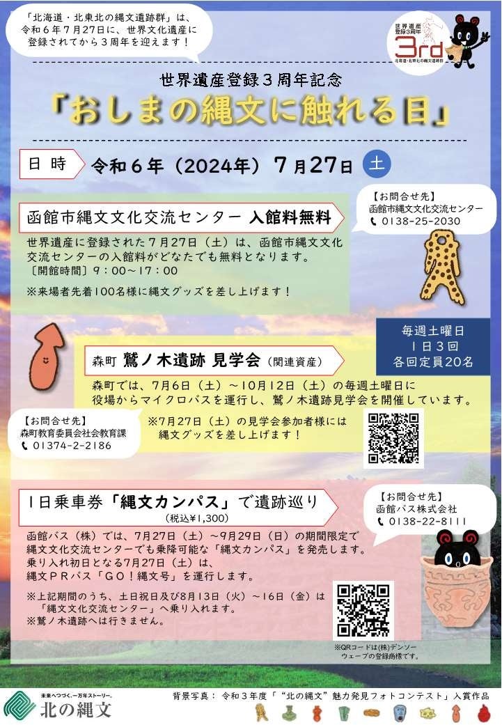 さらに、7月27日(土)に「北海道・北東北の縄文遺跡群」が世界遺産登録3周年を迎えることを記念し、渡島管内の縄文遺跡群等で「おしまの縄文に触れる日」を実施します。
