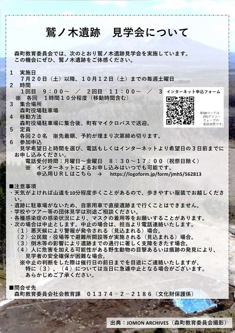 7月6日(土)~10月12日(土)の毎週土曜日に、森町役場からマイクロバスを運行し、鷲ノ木遺跡見学会を開催しています。参加者には縄文グッズも配布します。