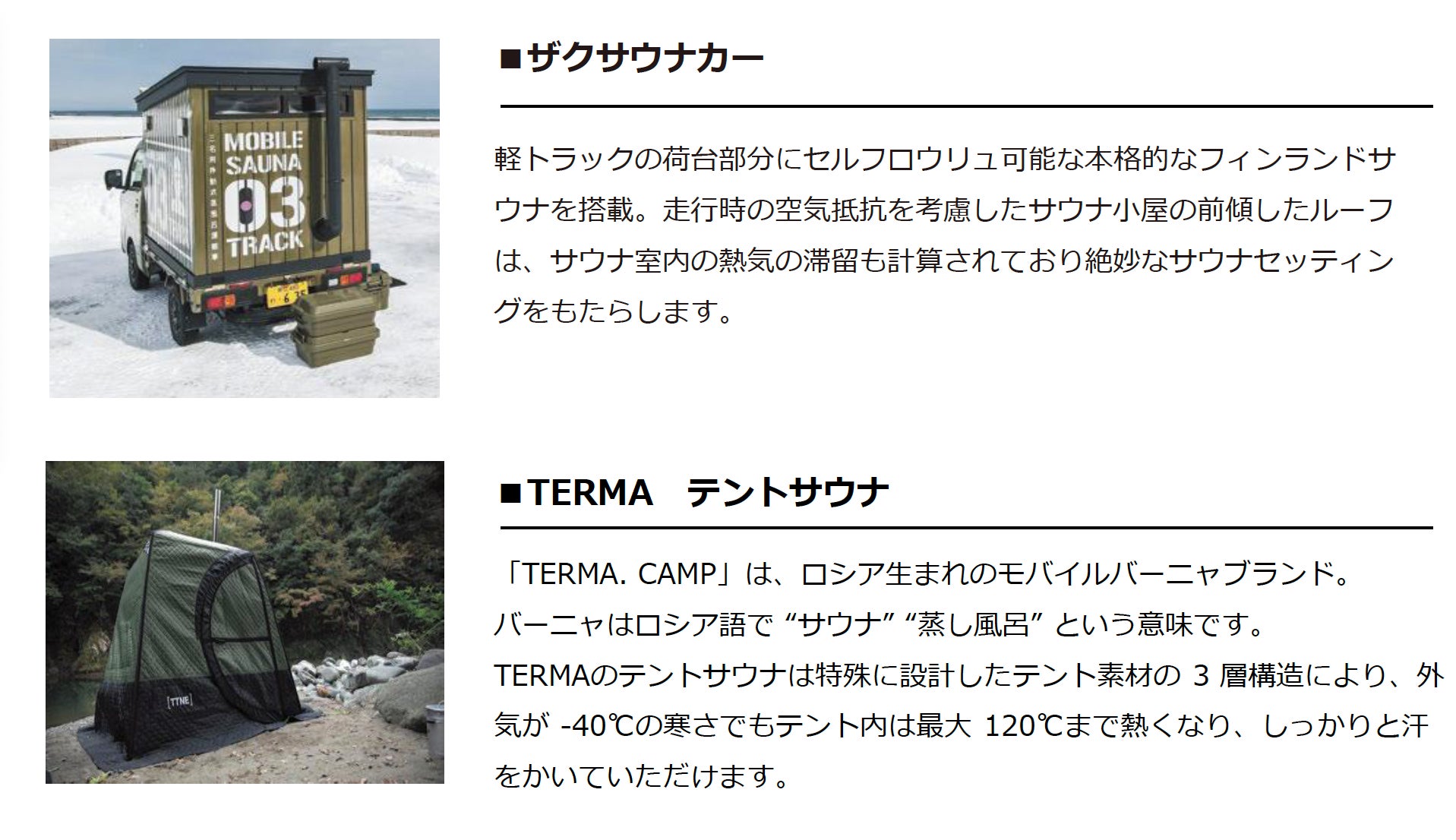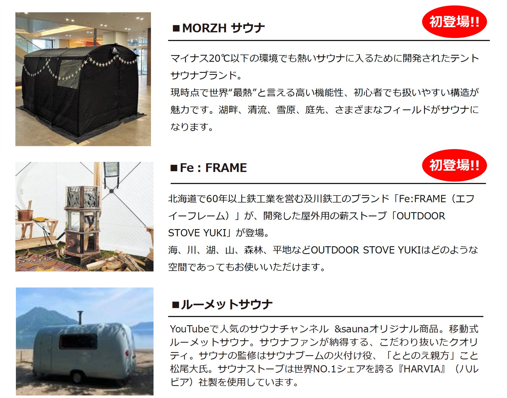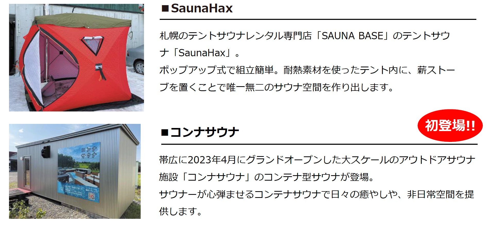 道内の10種以上のサウナが今年も会場に集結します!温度、湿度、見た目、ブランド、珍しさ