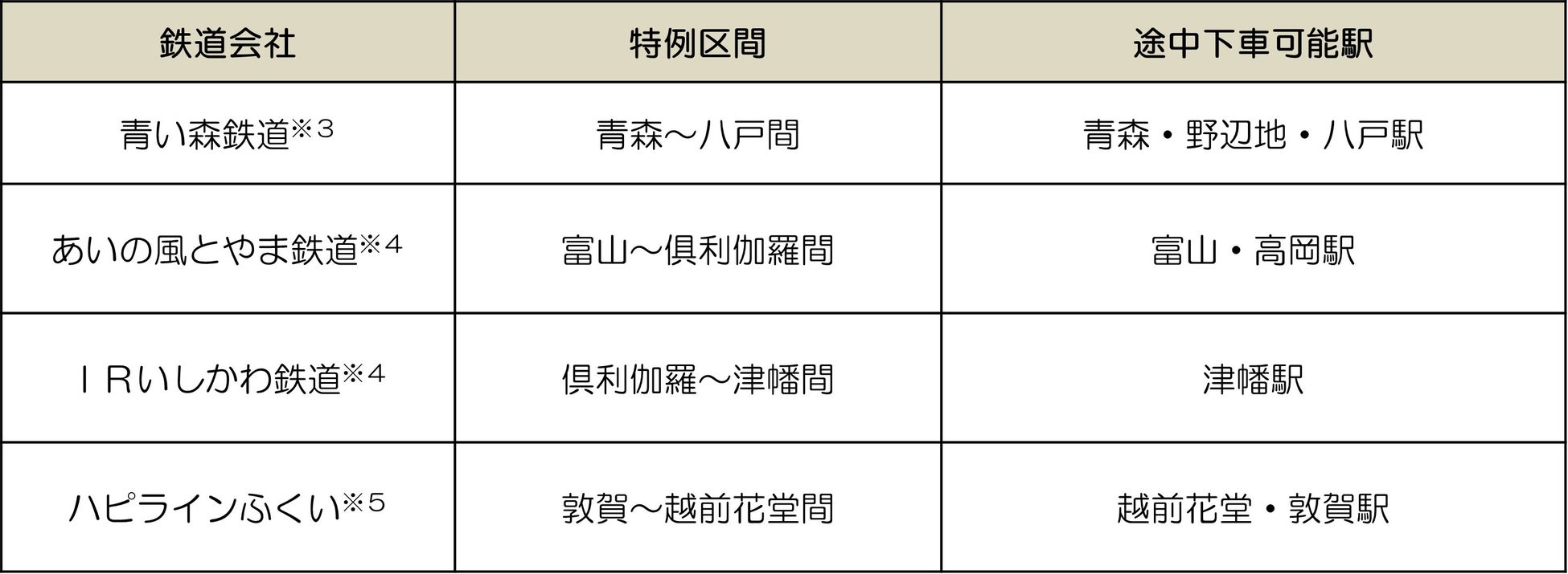 ※4 あいの風とやま鉄道線及びIRいしかわ鉄道線は、西富山以遠(越中八尾方面)の駅と氷見線・城端線の駅(高岡駅除く)または七尾線の駅(津幡駅除く)との移動に限ります。