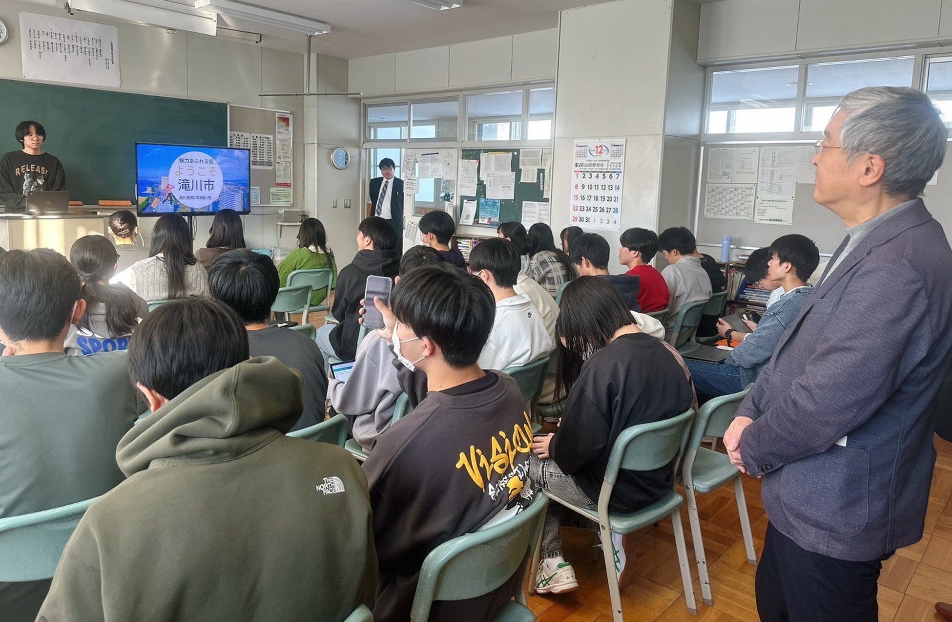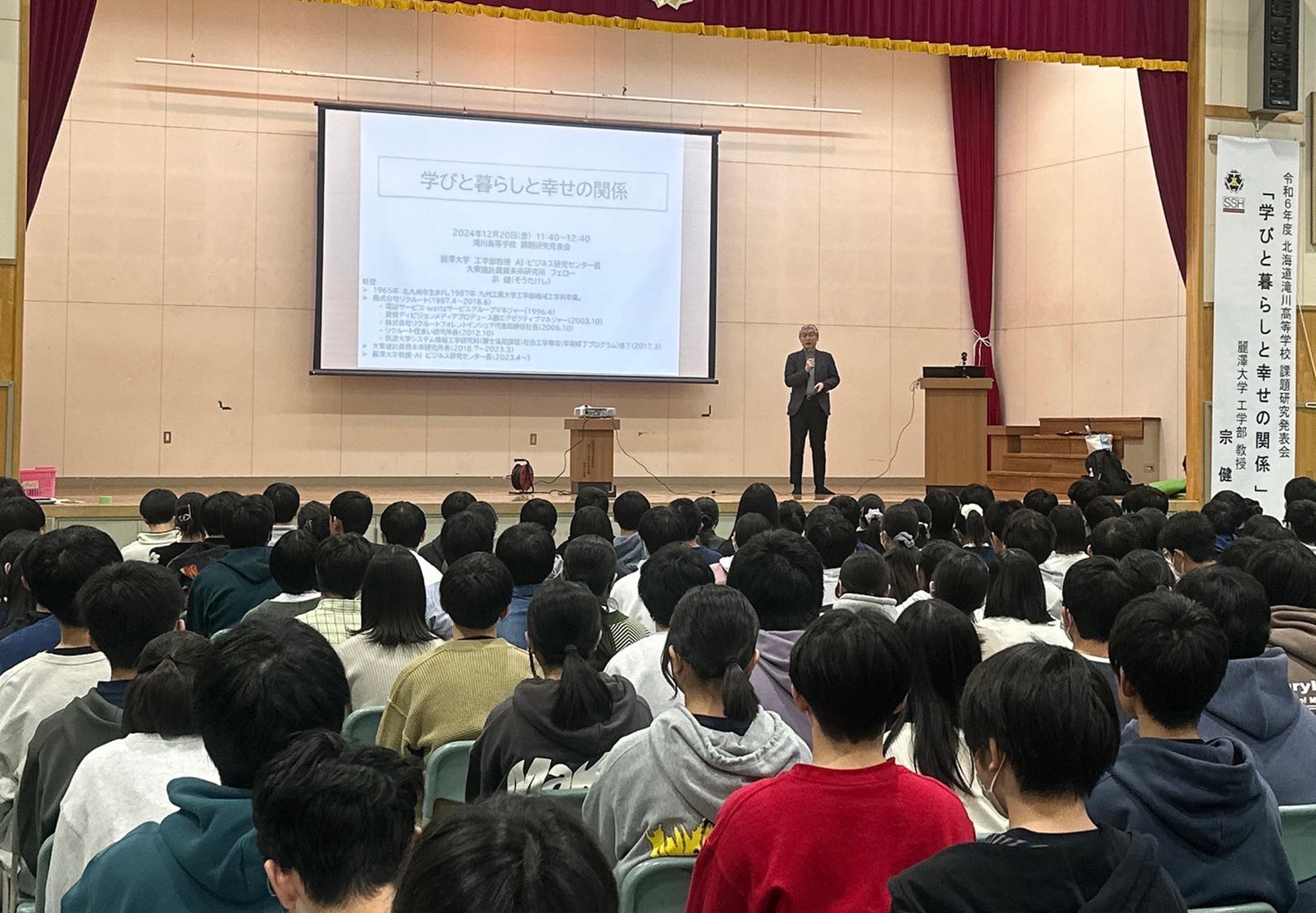 北海道滝川高等学校は、北海道に10 校しかない、文部科学省の指定するスーパーサイエンスハイスクール(SSH)の一校です。SSH のカリキュラム開発において総合探究の授業は、最重要項目のひとつに位置づけられており、今回の特別講演は、同校の普通科の生徒を対象に行う、総合探究の授業の一環として実施されました。