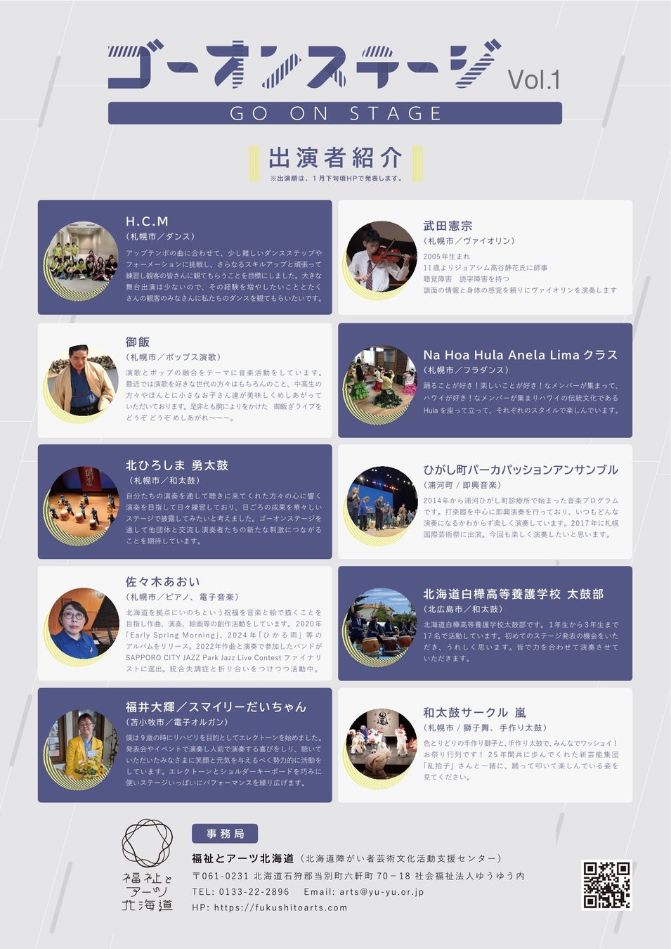 道内で活動する障がい者の芸術文化活動の活躍の場を拡げ、障がいの有無を問わず多様な人々との交流が促進されることを目的に、この度、ステージ発表会「ゴーオンステージ」を開催します。 初開催となる今回は、ダンス・音楽演奏など様々な出演者10組が登場します。
