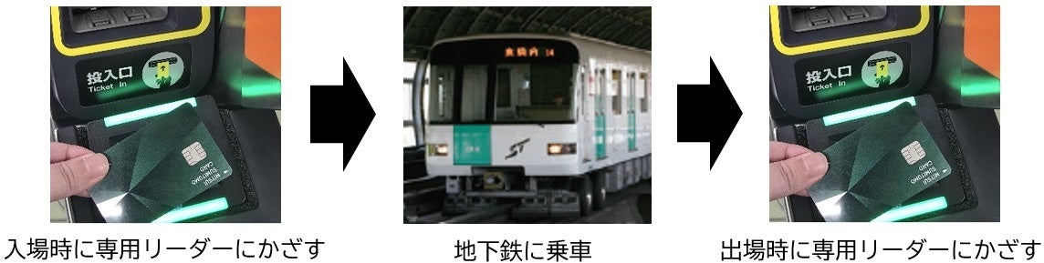 タッチ決済に対応のカード(クレジット・デビット・プリペイド)や、同カードが設定されたスマートフォン等を自動改札機に設置された専用のリーダーにかざすことで、地下鉄にご乗車いただくことができます。