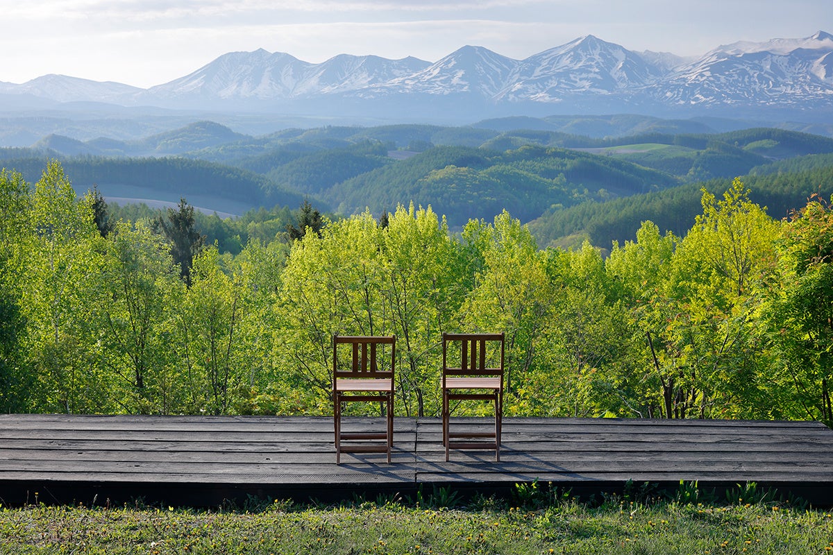 美瑛町在住の写真家、中西敏貴氏の風景写真が展示されたカフェ&ギャラリー。展望デッキから実際の景色と写真を見比べながら、スペシャリティコーヒーなどこだわりのドリンクを楽しめます。残雪の十勝岳連峰と緑の大地をともに一望できるのは初夏の6月ならではなので、天気のいい日にゆったり味わってみて。また、車で約9分の距離には1988年から工房を構えるシャルキュトリーがあります。レストラン内で自家製品の盛り合わせや道産食材を多用したメニューも提供しているので、一緒に立ち寄るのがおすすめ。