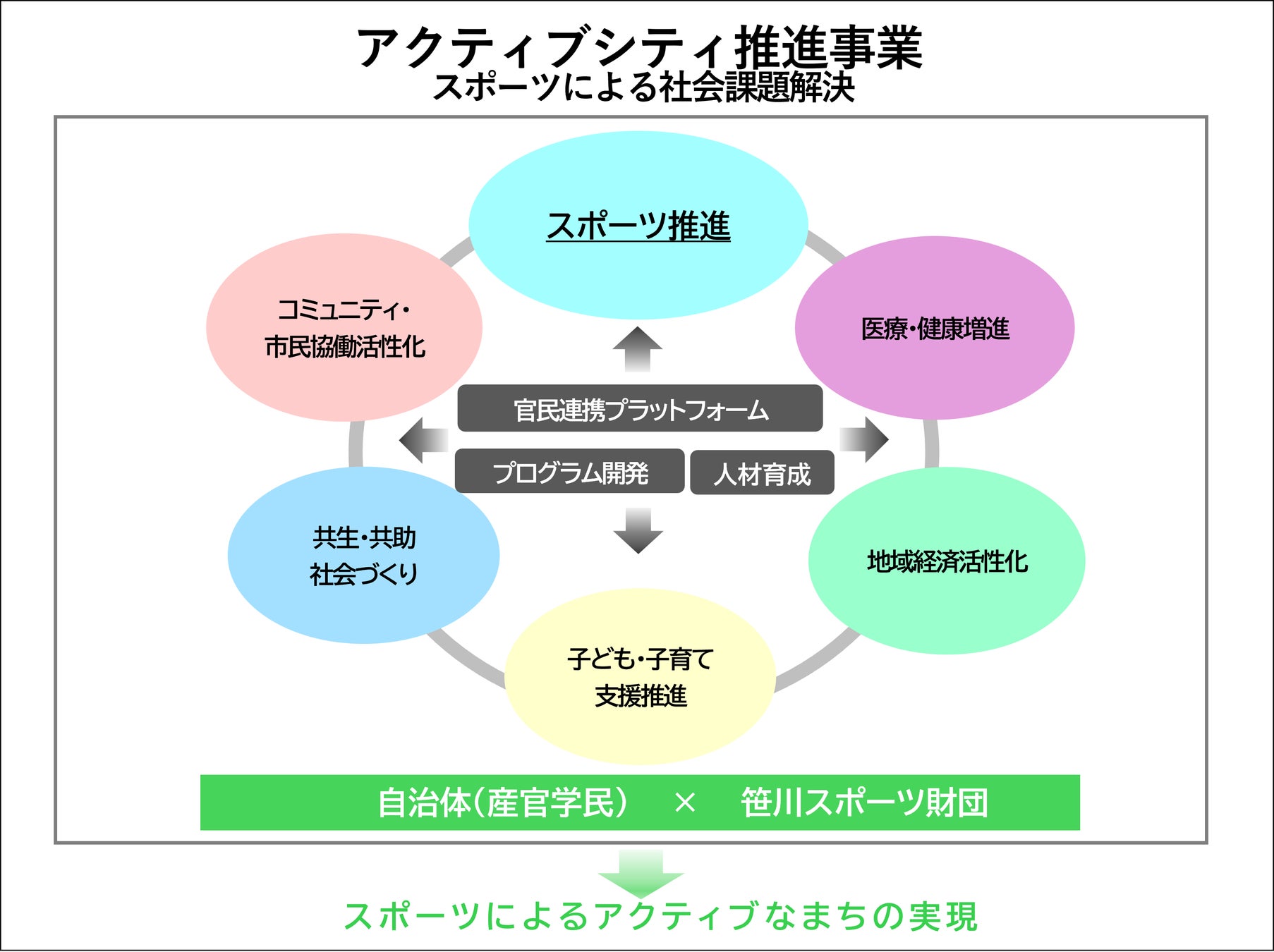 本事業では、SSFが自治体とパートナーシップを確立し、官民連携プラットフォームの構築、共創プログラムの開発、人材育成プログラムへの参画機会の提供などにより、アクティブシティの実現に向けて取り組む自治体を支援します。
