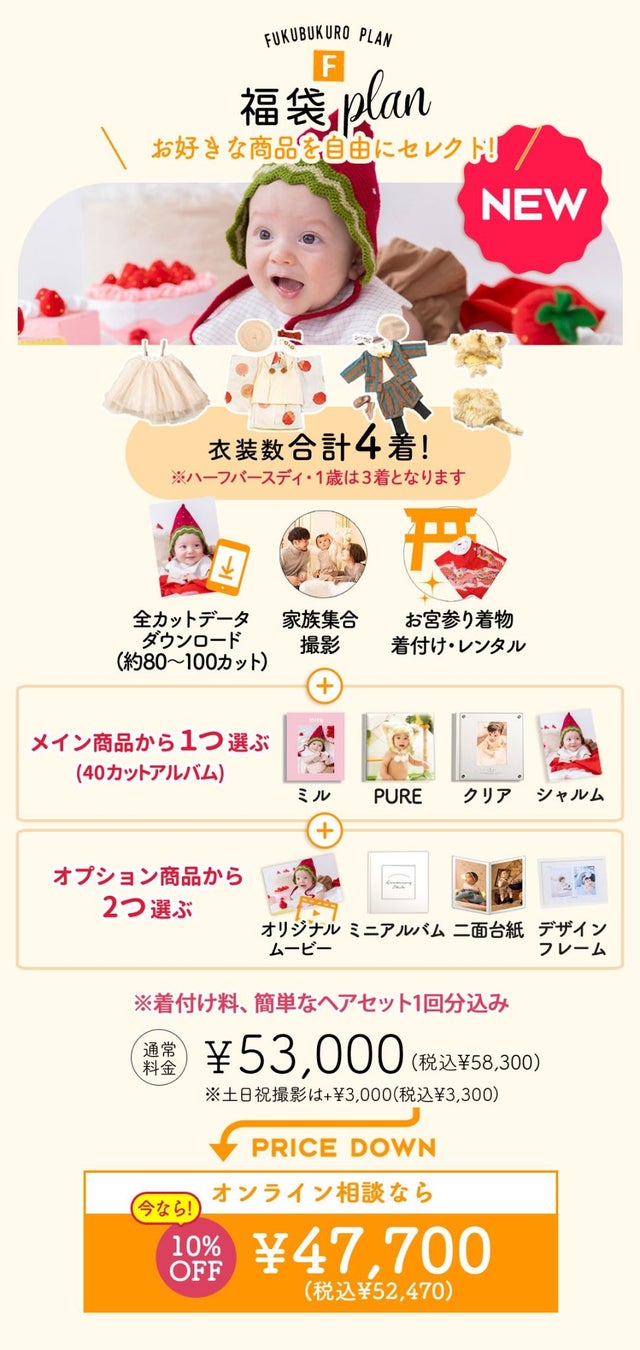 福袋プランは、赤ちゃん〜七五三、入学までのベビー・キッズ撮影の撮影プラン。