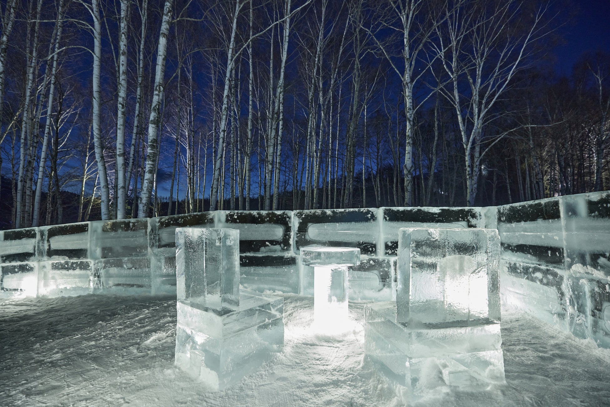 一枚氷で造られた氷のホテルに「氷のテラス」が登場。氷で造られたテラスには、氷で造られた椅子と机が設置されており、目の前には白樺の木々が広がります。ランタンの暖かい光が照らす空間で、夜のひとときを楽しめます。また、2025年2月28日(予定)までは宿泊体験だけでなく、見学も可能。客室からテラス、露天風呂まですべてが氷でできた幻想的な空間を体験できます。
