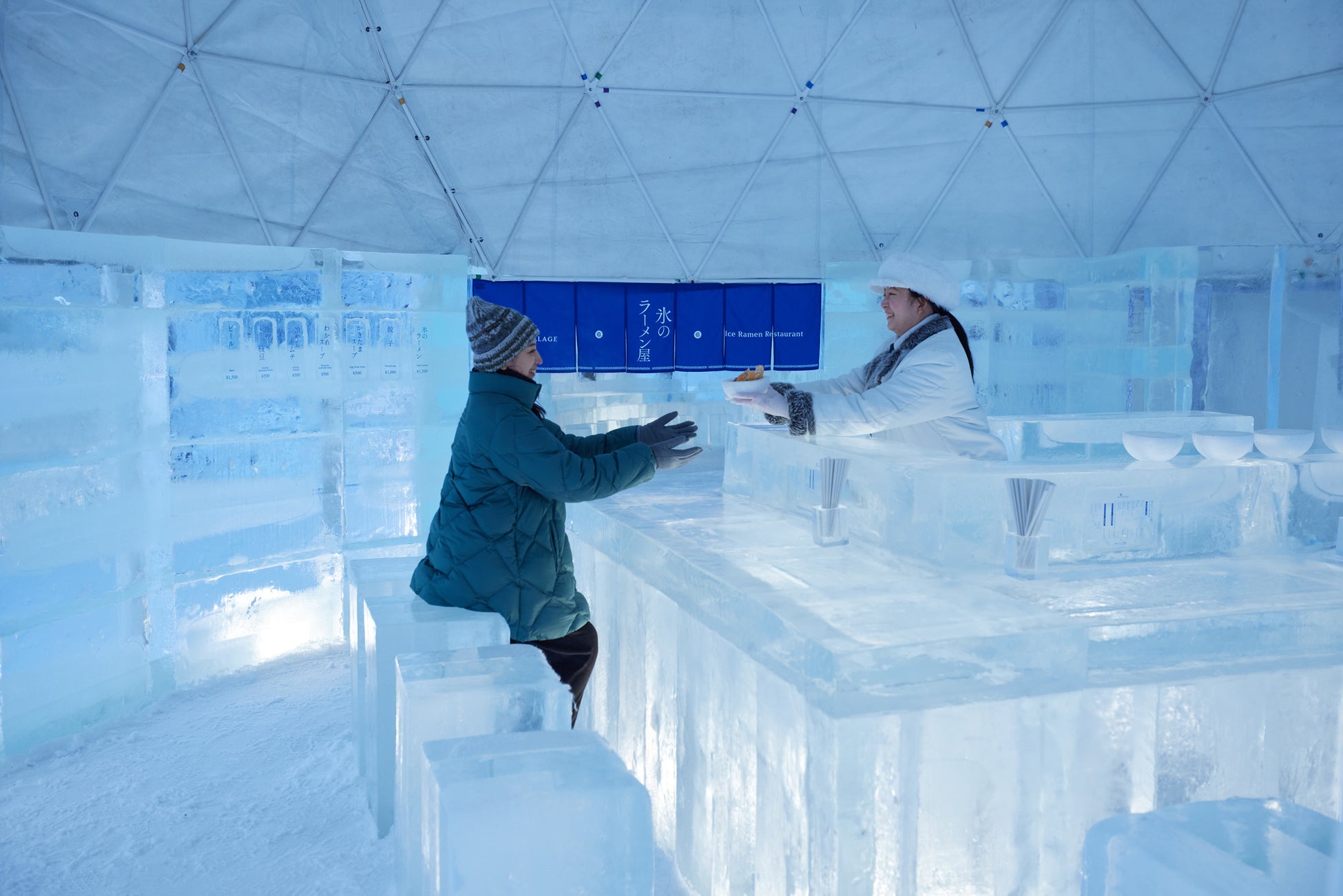 氷の器に冷たい麺と冷たいスープ、凍ったトッピングを乗せた「氷のラーメン」を今年も提供します。北海道ならではの昆布の出汁を使用したスープと、トッピングのおぼろ昆布がラーメンの味わいを深めます。さらに今冬は、氷のラーメンと一緒に楽しめる餃子が登場。アツアツの餃子を凍ったタレにつけて食べることで、口の中でシャリっとした食感と餃子の味わいが広がります。