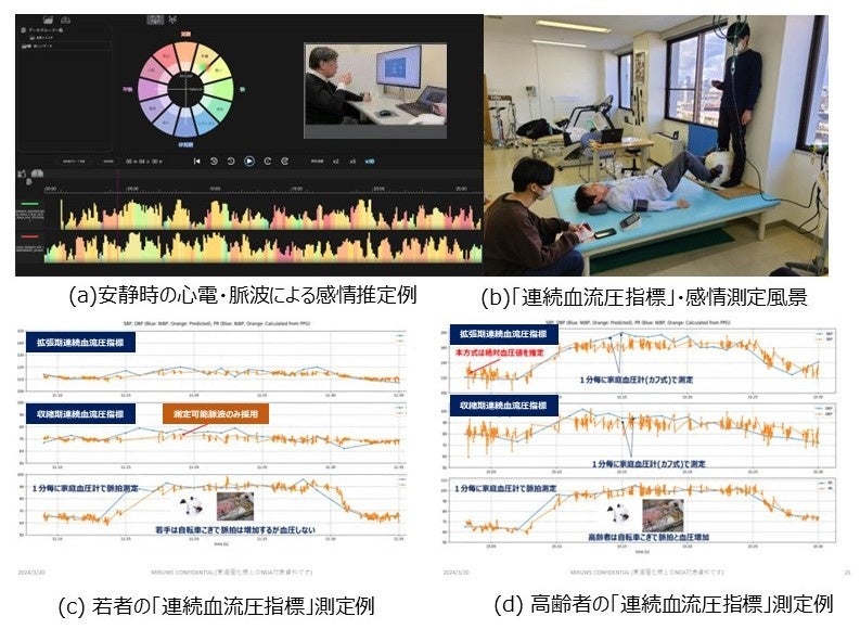 図3(a)は心電による感情推定と脈波による推定の比較結果、(b)は実験風景、(c)は若者(20歳以下)の「連続血流圧」推定結果、(d)は高齢者の推定結果です。 学生はエルゴメータによる運動時に脈拍が増加しても、血圧は上昇しないのに対して、高齢者は血圧の増加が顕著に表れる傾向を血圧計同様に本センサでもとらえています。