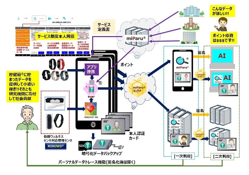 「貯健箱(R)」アプリは(1)リストバンド等と連携した「仮想ウェルネスセンサ」で得られるバイタル・メンタル・ライフの各データ、(2)スマホのカメラで取得した薬、健康食品ラベル、食事、間食の時刻付写真、(3)スマホのGPSやビーコン信号(BLE)から得られる位置情報、(4)スマホアプリのアンケートで取得した個人データや主観データ、といったパーソナルデータを、日付日時とともに、被測定者の秘密鍵によるデジタル/電子署名を付与されたのち、暗号化して自身のスマホやローカルサーバに保管できます。 市販薬や健康食品会社などが、例えば対象製品と血圧や睡眠との関係のビックデータを取得したい場合には、目的・取得対象データ・取得対象期間・取集元、二次利用の可否・ポイント付与有無等を記載したサービス定義書をスマホの「貯健箱(R)」アプリにセットし。本人の同意が得られれば、貯健箱は対象とするデータをアクセス者指定の暗号データとして提供します。