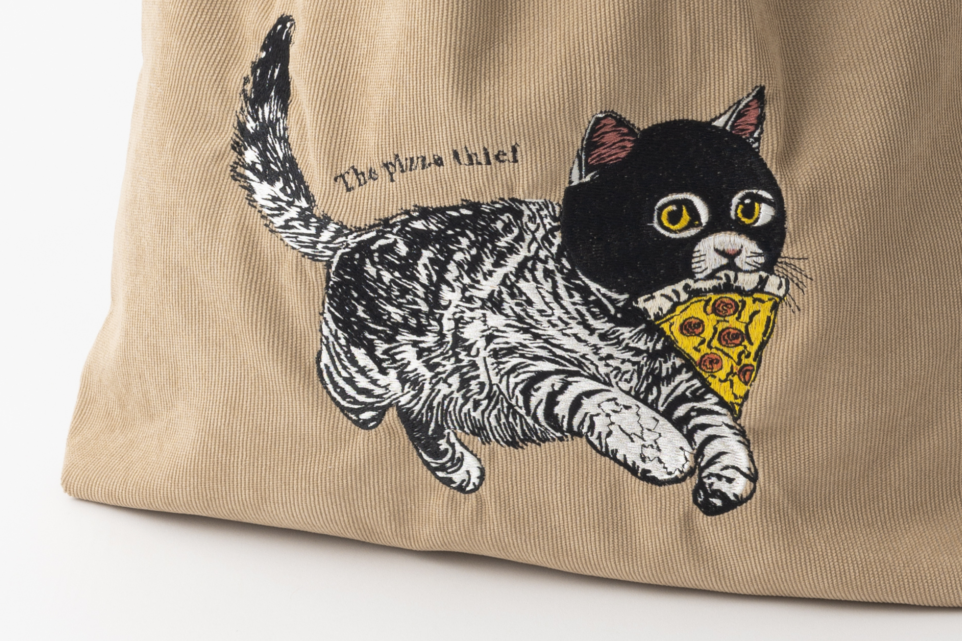 目出し帽を被った猫ちゃんがちゃっかりピザを盗んでいく現場を描いたデザイン