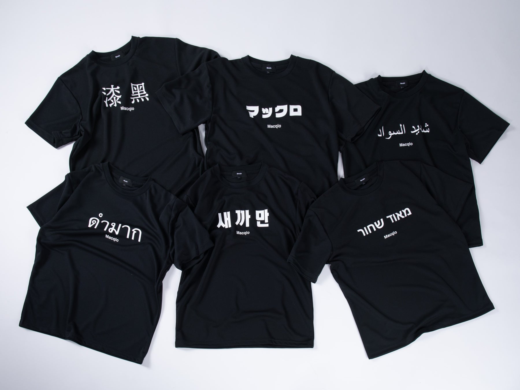 店頭にて税抜1万円以上お買い上げの方を対象に、日本・韓国・中国・アラビア・タイ・ヘブライの6つの言語で「真っ黒」とプリントされた「Macqlo world tee」をプレゼントいたします。