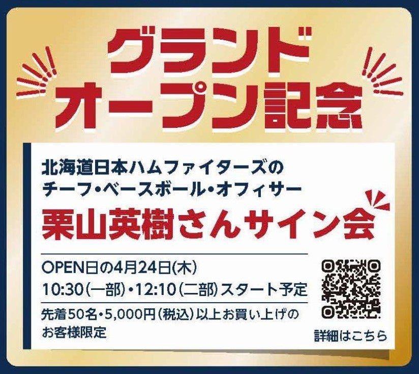 また、オープン当日の2025年4月24日(木)には、オープンを記念して北海道日本ハムファイターズのチーフ・ベースボール・オフィサーでスケッチャーズ ジャパンのアンバサダーを務める栗山英樹さんをお招きして、サイン会を開催いたします。店内商品を税込5,000円以上ご購入いただいた先着50名様がご参加いただけます。