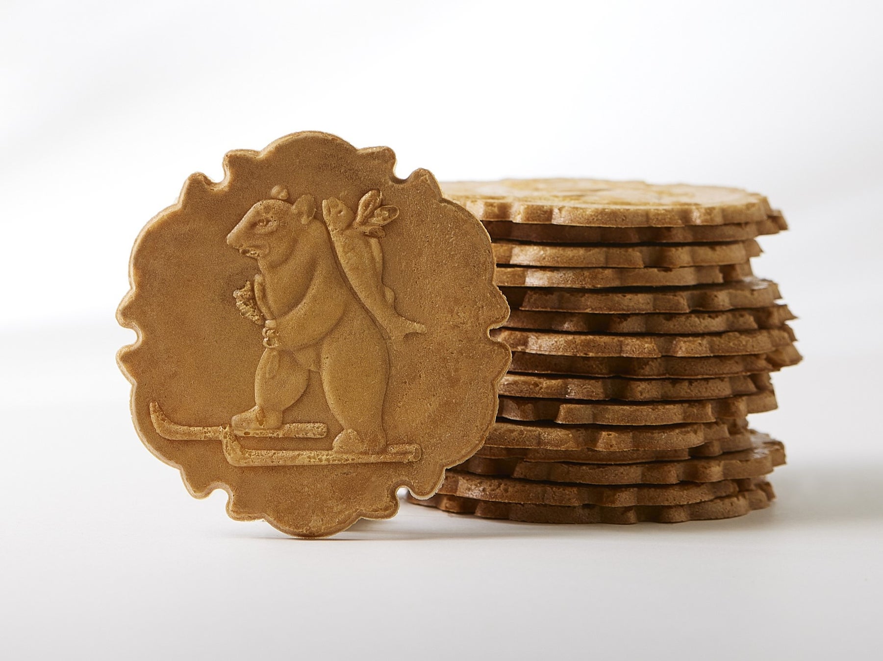 札幌千秋庵の山親爺は、上質なバターとミルク、卵を使用した風味豊かな洋風煎餅です。笹の葉と鮭を背負って、スキーにのった熊がレリーフになっています。