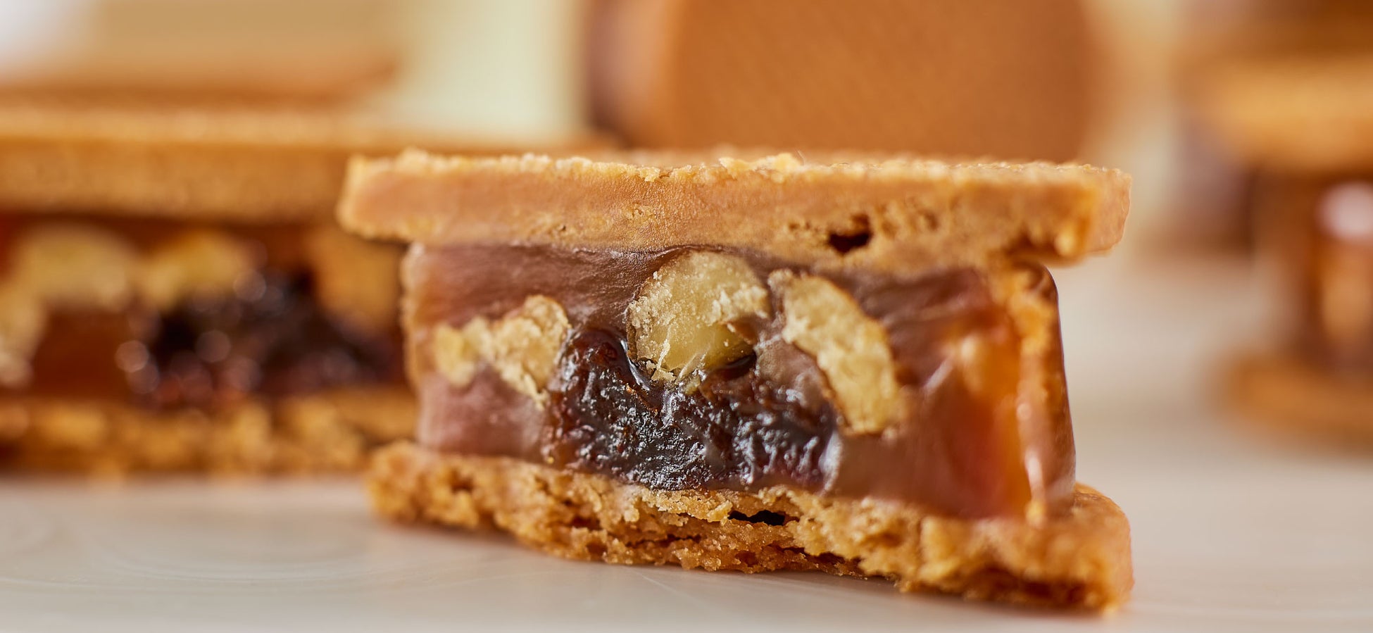 キャラメルを絶妙なやわらかさに仕上げることで、フレッシュ感あふれる、まるで生菓子のようなこだわりの味わいを叶えました。キャラメルの濃密な味わいと豊潤なバターの香り、くるみの香ばしさと程よい噛み心地、柔らかなレーズンの風味と酸味がキャラメルの甘さにアクセントを添え、口の中で一つになり複雑で繊細な美味しさを作り上げます。さくさくのクッキーと共に美味しさ広がる「くるみのキャラメルサンド」です。
