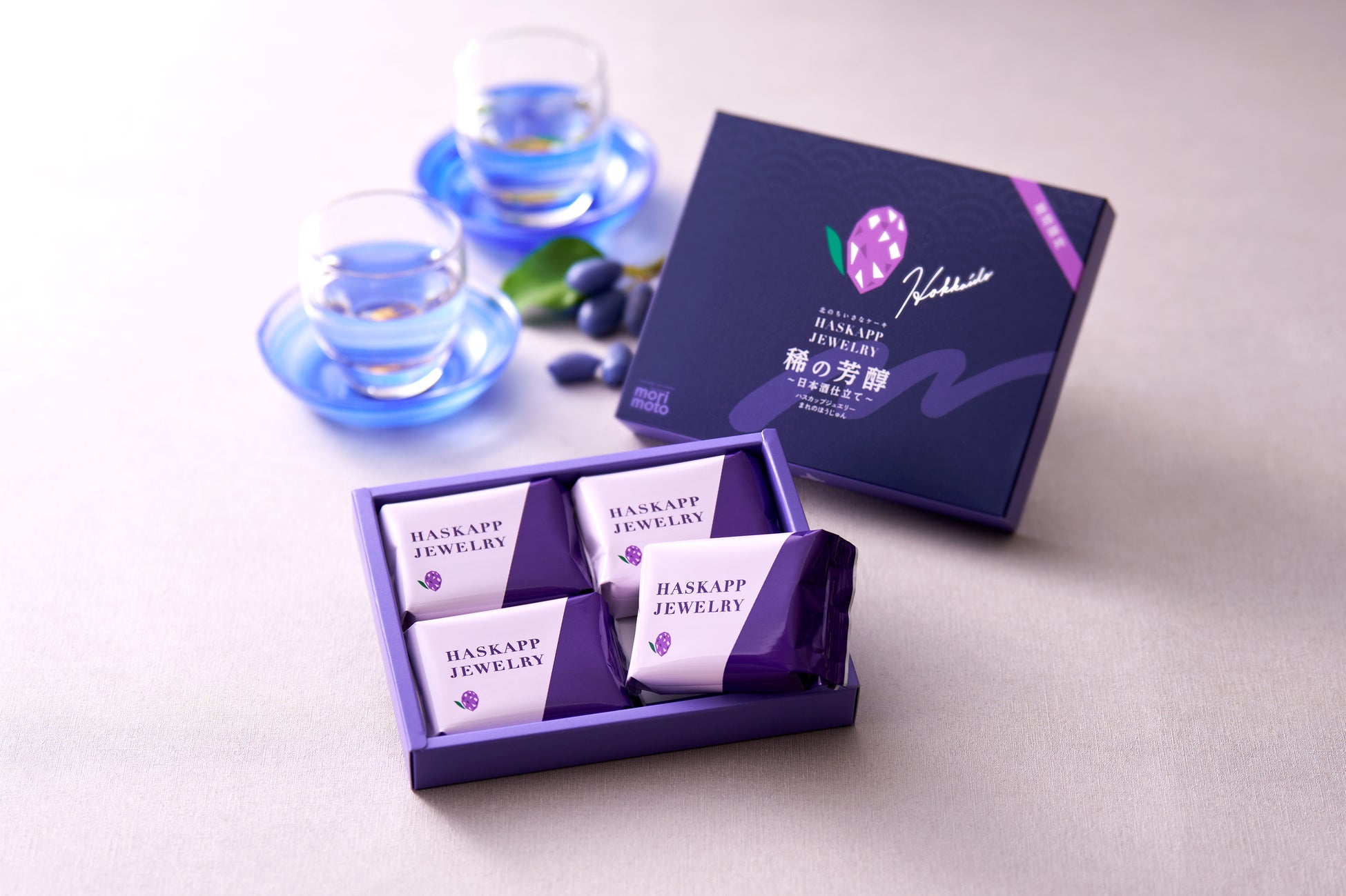 北海道特産の果実である「ハスカップ」は、希少性の高さと美しい紫色の見た目から、まるで紫に光る原石のようです。この実で作るジャムとバタークリームを薄焼きクッキーでサンドした、もりもとのロングセラー商品「北のちいさなケーキ ハスカップジュエリー」に北海道の寒冷な大地が育んだみずみずしい味わいの日本酒「吟風國稀」を掛け合わせました。今年3番目となる特別な季節のジュエリー「稀の芳醇」は、6月16日(日)に迎える父の日のプレゼントとしても最適な一品です。