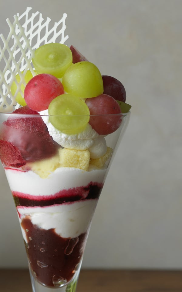 華やかな甘みのある旬の仁木町産ラ・ラ・シャイン®と、みずみずしい赤ぶどうを合わせた秋限定のパフェです。