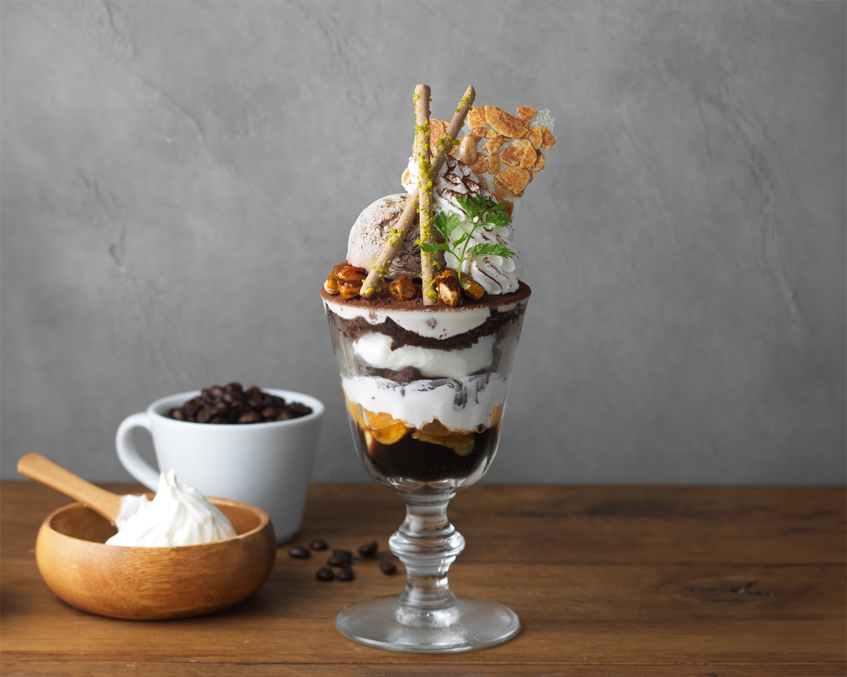 コーヒーの香りとほろ苦さ、ミルキーなグラスジャージーミルク、優しい甘さのマスカルポーネクリームを合わせたティラミスパフェです。