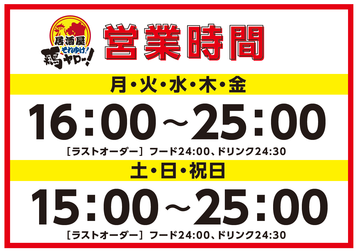 営業時間 :16:00〜25:00(月~金) 15:00~25:00(土日祝)