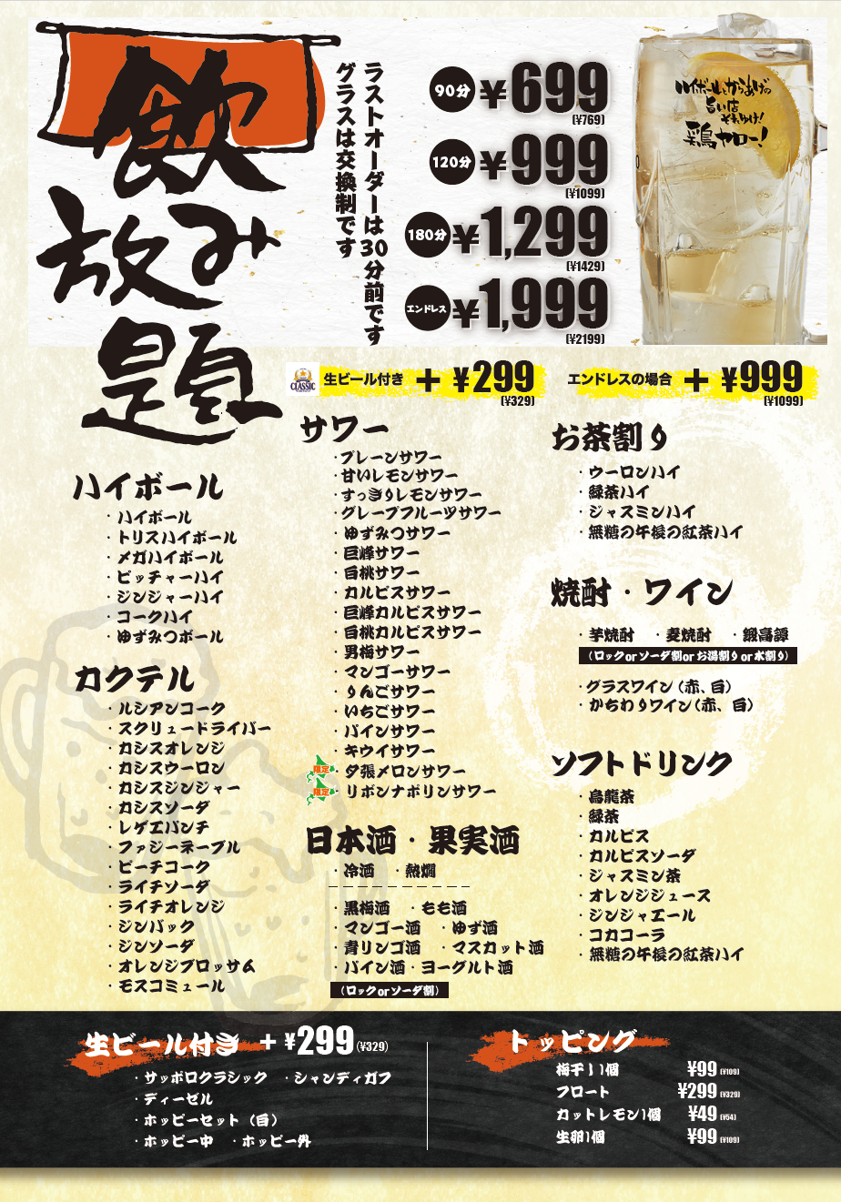 飲み放題メニューも激安!90分から閉店まで飲み放題の「エンドレス」もご用意!