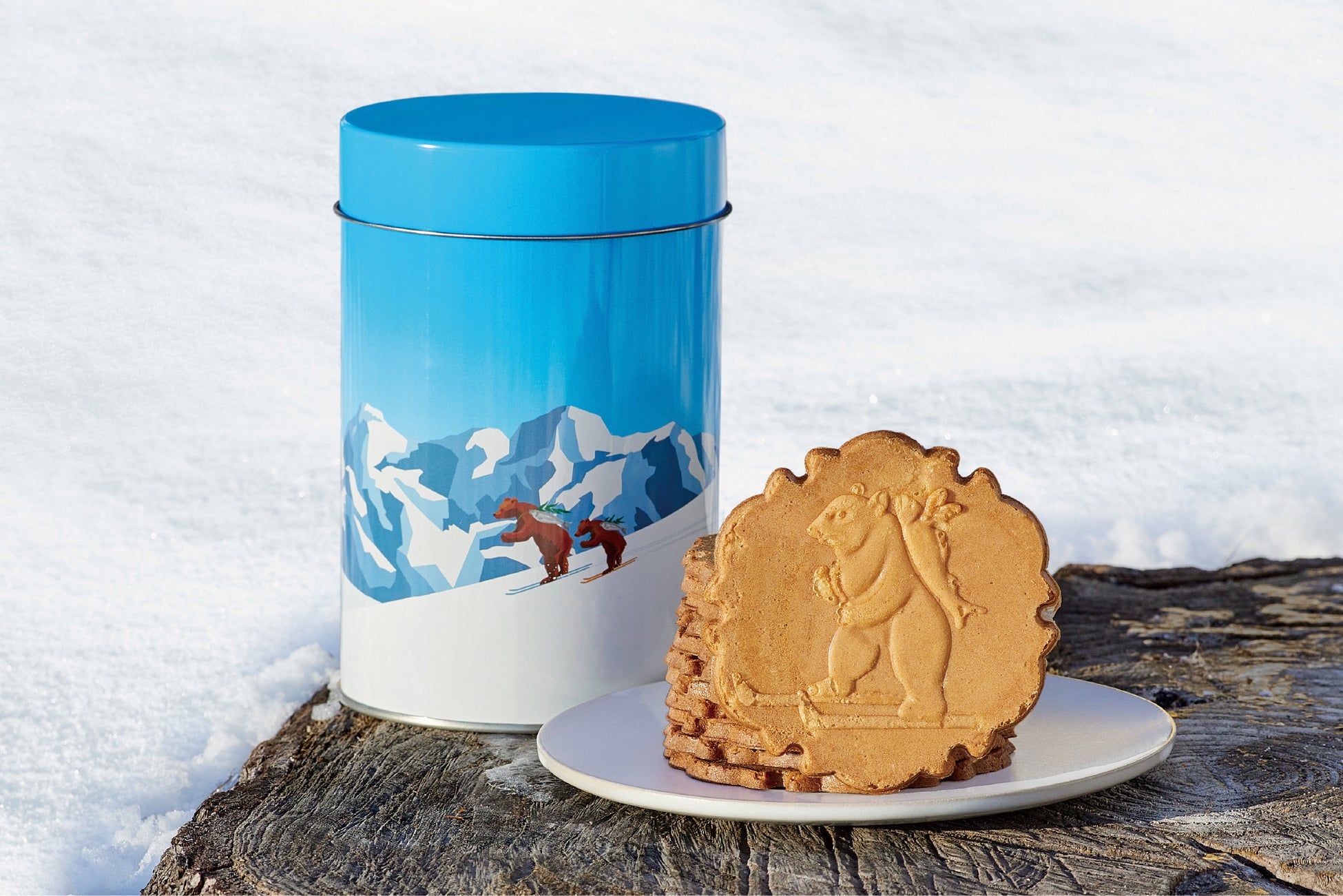 上質なバターとミルク、卵を使用した「風味豊かな洋風煎餅」で、パリッと食べ心地の良い食感が特徴の1930年(昭和5年)発売のロングセラー商品です。笹の葉と鮭を背負って、スキーにのった熊がレリーフになっています。2024年3月にリニューアルした新しいパッケージデザインは、北海道の澄んだ青空を背景に、笹の葉と鮭を背負った熊が、スキーに乗って雪山を滑り降りる姿を表現しています。