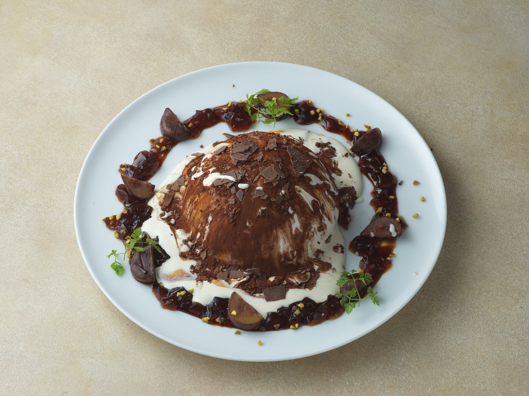 ふわふわで口どけの良いフロマージュスフレを土台に、ミルキーでなめらかなマスカルポーネクリームをたっぷりとのせました。奥深い味わいのコーヒーソース、 刻みチョコレート、ココアパウダーをトッピング。 ほっくりとした甘みの渋皮栗を合わせたティラミス風の 冬限定ふわとろスフレをお楽しみいただけます。
