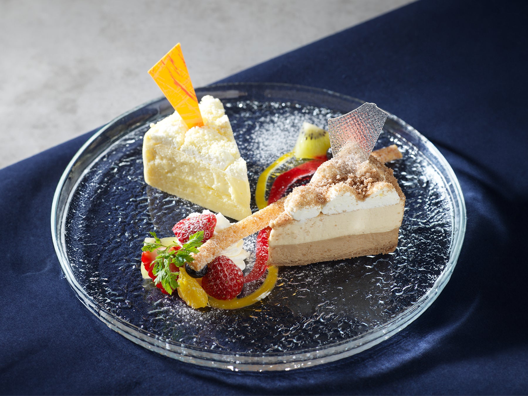 ルタオ看板商品の2層仕立てのチーズケーキ「ドゥーブルフロマージュ」と、ベイクドチーズケーキとレアチーズムースそれぞれにヘーゼルナッツのペーストを使用したナッティな味わいの「ショコラオレノワゼットドゥーブル」を一度にお楽しみいただけます。