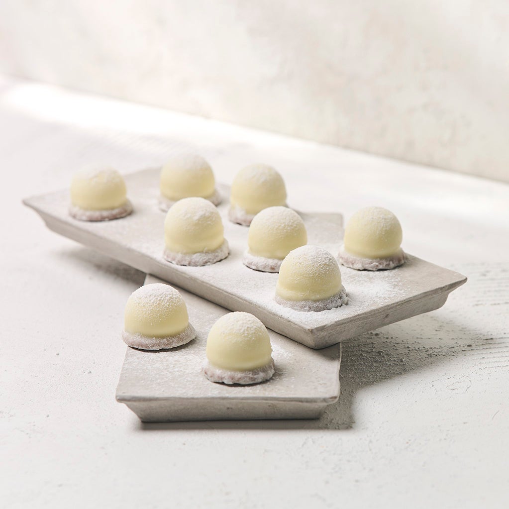 練乳クリームをチーズチョコで閉じ込めた真っ白な雪を丸めたようなお菓子。口に入れると雪のようにとろけてチーズの香りがふわっと広がります。