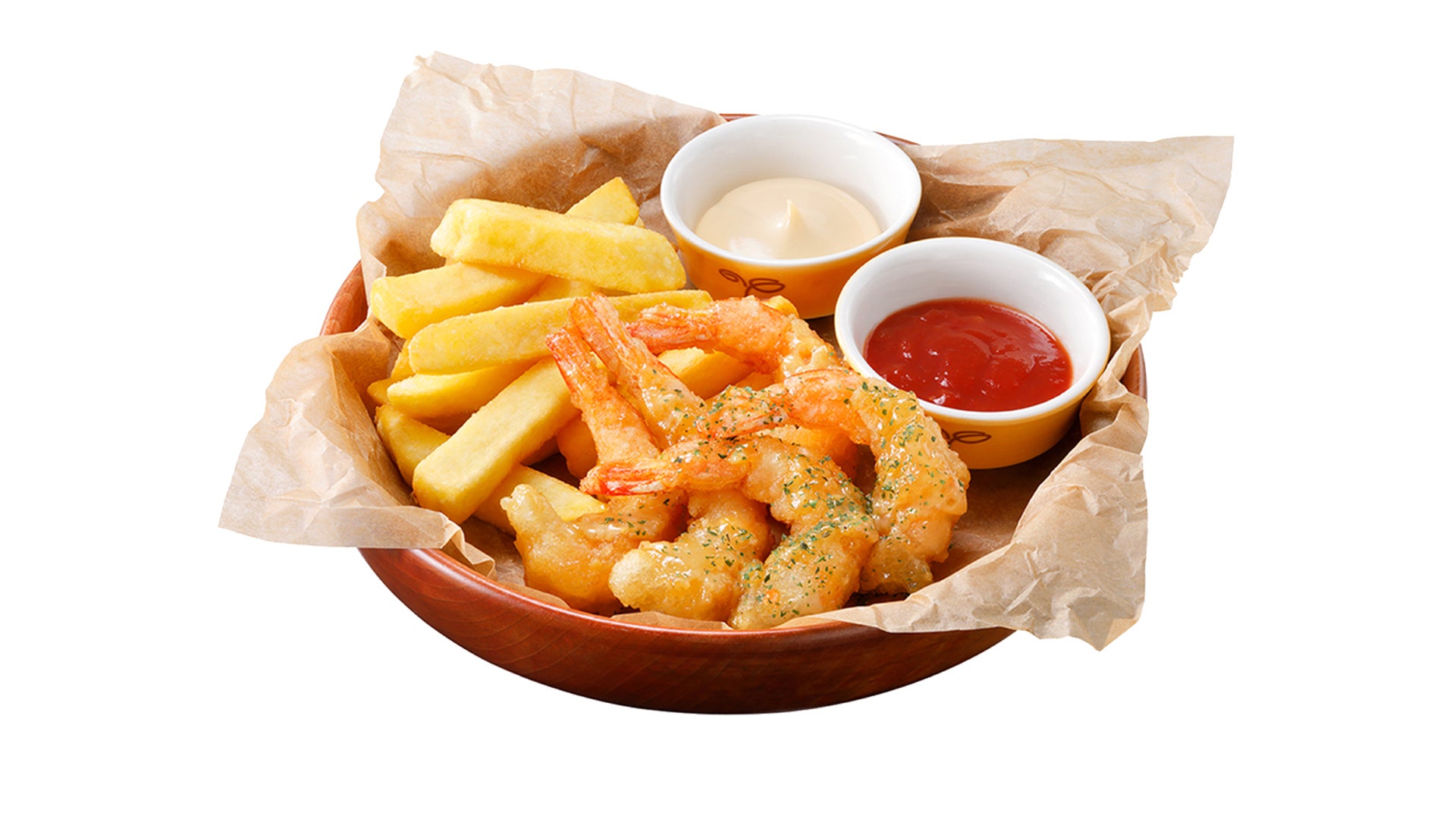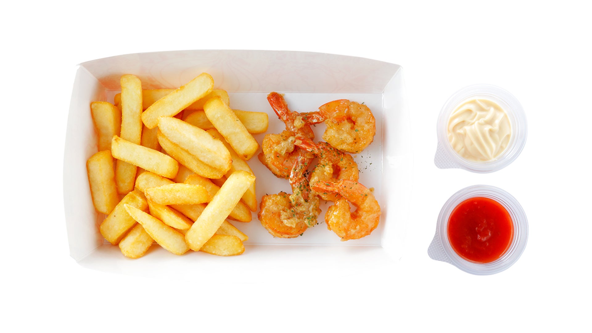 肉厚なエビのプリプリ食感と、ガーリックの風味。フライドポテトとご一緒に。