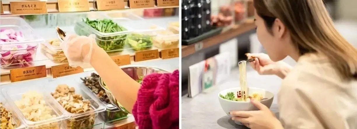 店内の冷蔵ケースに並べられた野菜や具材からお好きなトッピングを選び、ボウルに入れてスタッフにお渡しください。(どれをお選びいただいても1g 3.1円)