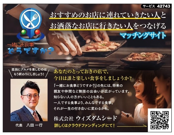 知恵の種を蒔き、すべての人に価値を創造することを企業理念に、便利なサービスを提供し続ける「株式会社 WISDOM-SEED(ウィズダムシード)」(代表:八田一行、所在地:北海道千歳市、以下、ウィズダムシード)は、純粋に食事を楽しみたい方同士を繋ぐためのマッチングサイト「一緒にお食事どうですか?」をクラウドファンディングサイトのCAMPFIRE(キャンプファイヤー)にて先行販売開始します。
