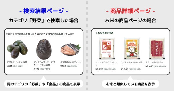 検索結果ページでは「このカテゴリを買っている人がよく買っているカテゴリの商品」、商品詳細ページでは「その商品と類似している商品」をおすすめとして表示することが可能になりました。