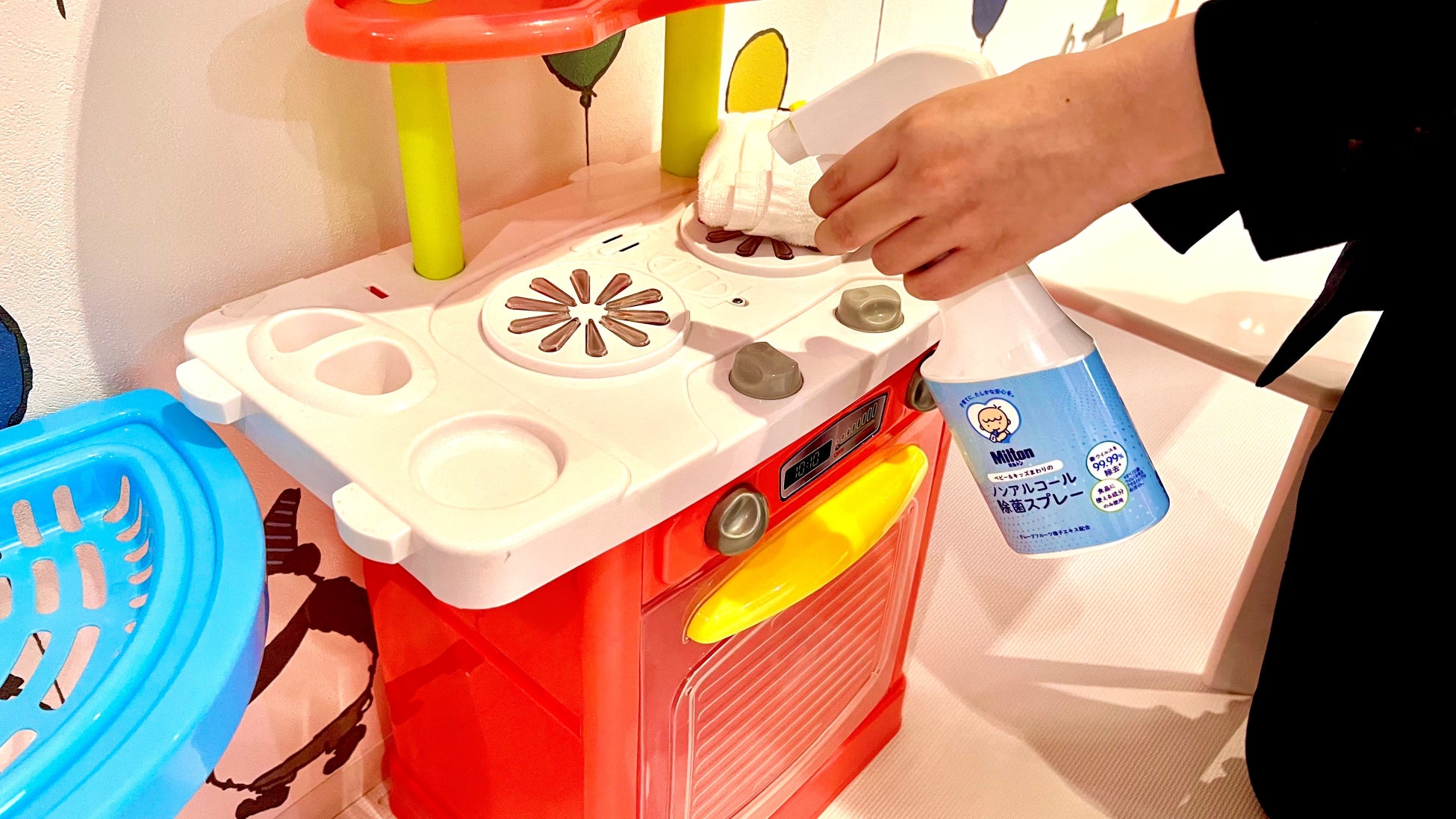 - お子様が触れるおもちゃ類すべてを毎日、時間を決めて定期的にノンアルコール除菌清掃を行っておりますので安心して触って頂けます。(赤ちゃんまわりのベビーグッズ専用の除菌スプレーを使用しております)