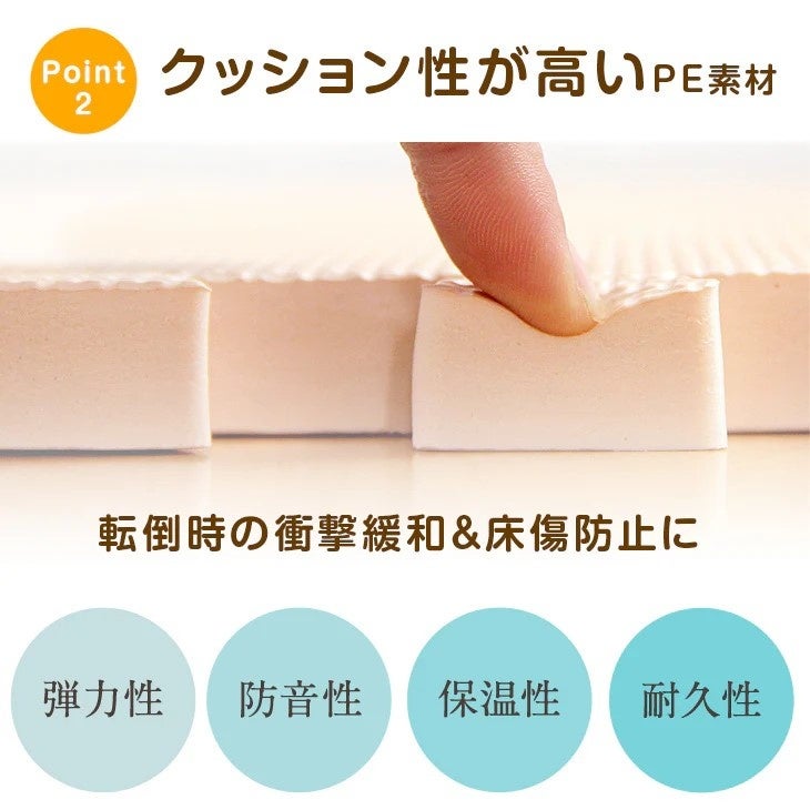 - 弾力のある床材を採用しており、滑り台で遊んでの着地時や飛び跳ねた寝転がったりして遊んでいるときでも衝撃緩和性のある2cmの厚みのあるクッション性の高い床材を採用しております。