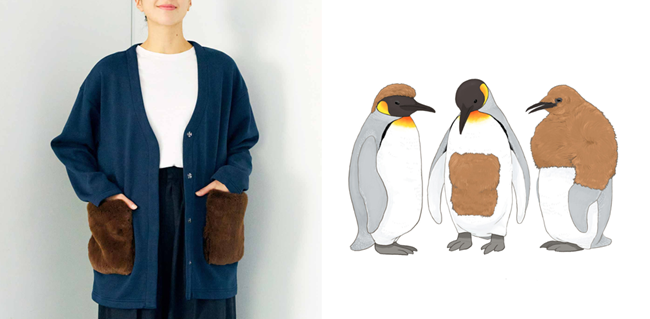 オウサマペンギンの思春期の姿をイメージしたカーディガンです。もふもふの羽毛で覆われたオウサマペンギンのヒナが大人になる段階で、中途半端に羽毛が残ってしまうなんとも愛らしい姿が再現されています。保湿性の高い裏起毛の生地をベースに、ポケット部分はヒナの羽毛をイメージした毛足の長いファー素材を使用。ネームタグに描かれた生え変わり中のヒナたちのイラストも“萌え”ポイントです。オウサマペンギンの成長を見守りながら、秋冬コーデを楽しめるデザインです。