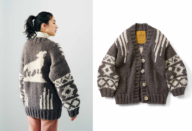 ペルーの編み子さんたちによってひとつひとつ手編みで仕上げられたウール100%のカウチン風カーディガンです。シンリンオオカミと針葉樹をモチーフにしたクラフト感漂う編み地や、一点ずつ見え方の違う水牛のボタン、オーバーサイズのシルエットが大人っぽいデザイン。ふっくらとやわらかく、一枚で暖かく着られるので、アウターとしても重宝します。染色をしていないので、羊毛の自然な色や風合いも楽しめます。