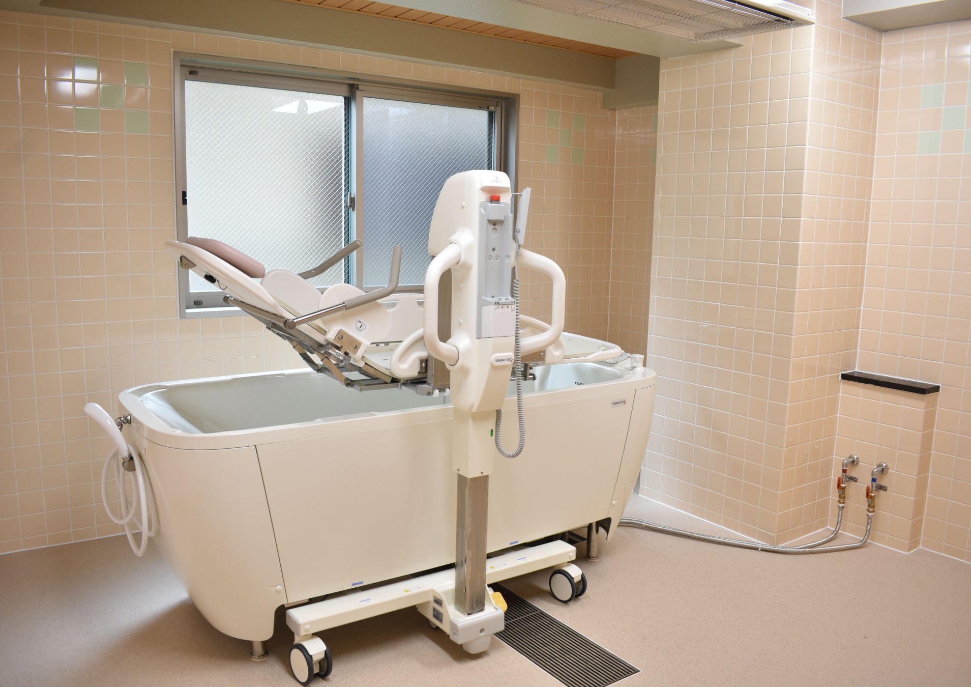 大浴場は浴室用車いすのまま浴槽に入れるようスロープを設置し、可能な限り大きなお風呂でゆったりと入浴していただけるよう工夫しています。もちろん、寝たきりの方など座位の保持が困難となられた方にも安心して入浴していただけるように機械浴槽もご用意しています。