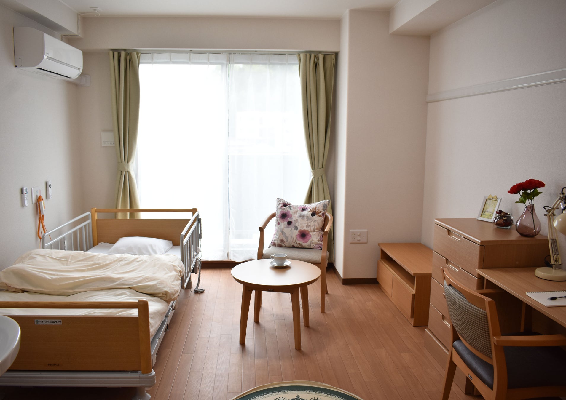 全てのお部屋が、お一人おひとりのプライバシーに配慮した個室(ワンルームタイプ・18.13~18.44㎡)で、緊急コールやスプリンクラーといった高齢者の安全をお守りする設備はもちろん、介護専用電動ベッドや手元で温水を操作できる車いす対応の洗面台をはじめとする、快適な生活を実現するためのさまざまな設備を整えています。