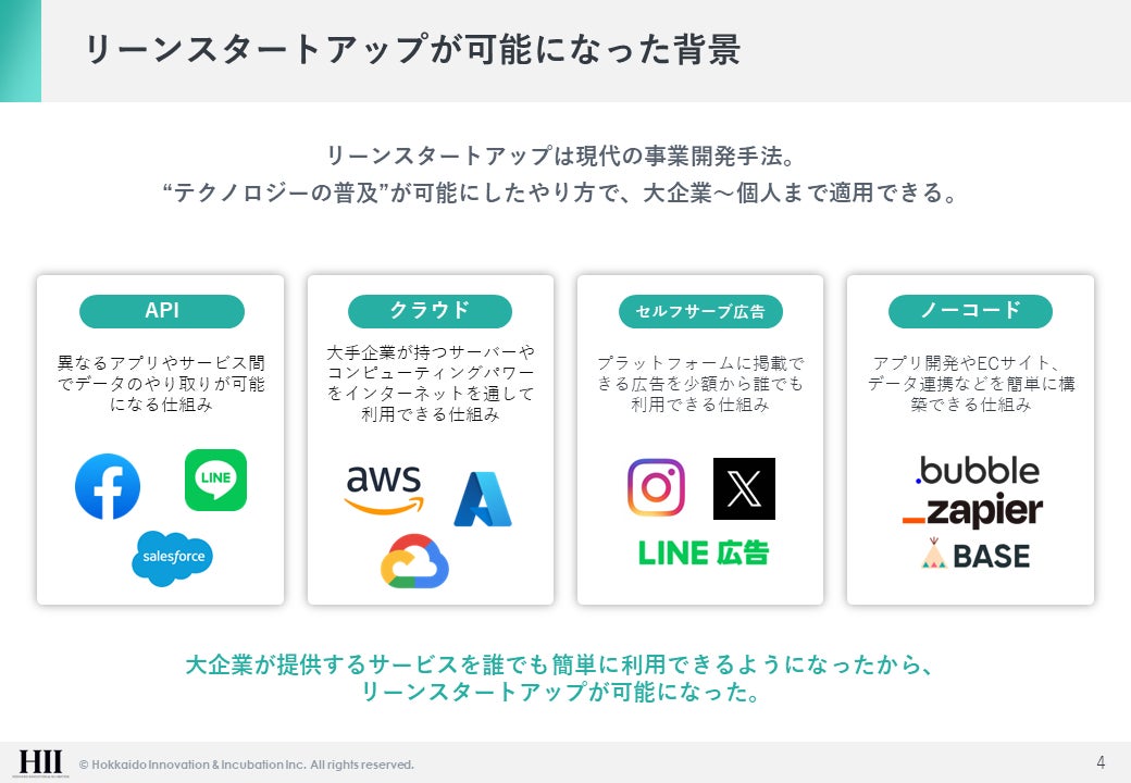 リーンスタートアップが可能になった背景には、近年のテクノロジーの発展とそれを誰でも自由に使える環境の整備が要因と考えます。
