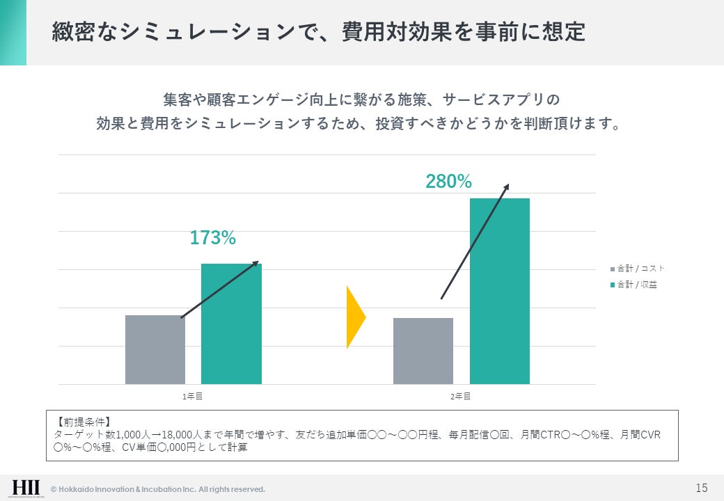 当社では実行前に、集客や顧客エンゲージ向上に繋がる施策、サービスアプリの効果と費用をシミュレーションするため、投資すべきかどうかを判断頂く事が出来ます。