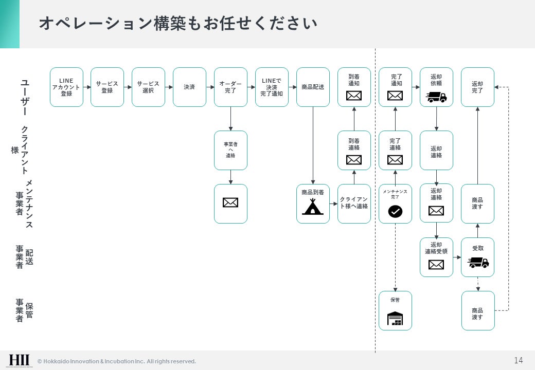 サービスの提供には、アプリケーション開発だけでは補えない部分が存在します。その際は人の手を介する業務も発生しますが、そのオペレーションフローも一緒に整理します。